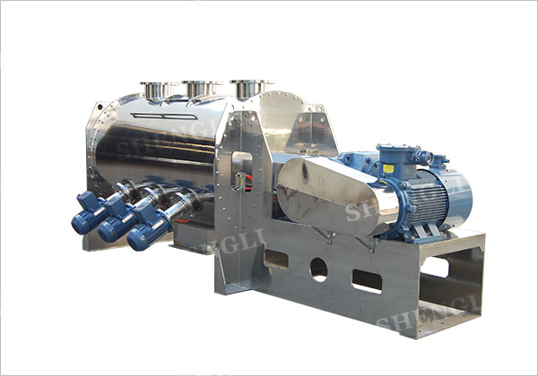 犁刀式混料机为单轴式强制搅拌设备,主轴上安装有多组犁刀式搅拌器,并且错位连续安装,结构上避免了搅拌死角,运转时,更产生了不间断式的漩涡离心作用力,错位的犁刀持续搅拌,漩涡离心物料流不断重叠、击散,致使物料沸腾,并行成对流循环,快速的搅拌物料。 结团性物料如纤维或受潮结团、加液凝聚的粉料,通过在犁刀混料机内安装的高速飞刀,结合犁刀搅拌器搅拌物料时形成的对流循环作用,对结团性物料进行打散、分离。 高速飞刀安装于犁刀混料机筒侧向下45度角,刀头伸入筒内,在搅拌时,物料受犁刀驱赶至飞刀有效范围,受飞刀高速剪切。